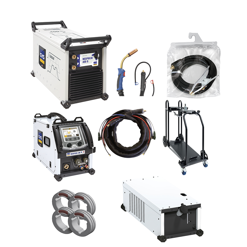 Digital technology, the NEOPULSE 400 G is a pulsed MIG/MAG welding power source with a separate wire feeder. Ultra high performance and designed for the highest performance level using the latest technology, it features +100 synergic curves and exceptional arc quality/performances. Intuitive and highly functional, its digital interface allows you to change welding parameters with ease. Equipped with its NEOFEED-4W reel (optional), this welding power source provides productivity and quality of unmatched welding on all types of alloys.