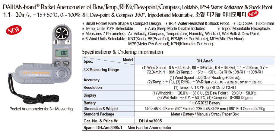 3x Measuring Range: (1) Wind Speed: 0.5-44.7m/h, 60~3937f/m, 0.4-38.8knt, 1.1~20.0m/s, 0.7 ~ 72.0km/h, 1~8bf, (2) Temp. : -15°C ~ +50 °C, (3) RH% 0% RH ~ 100%RH