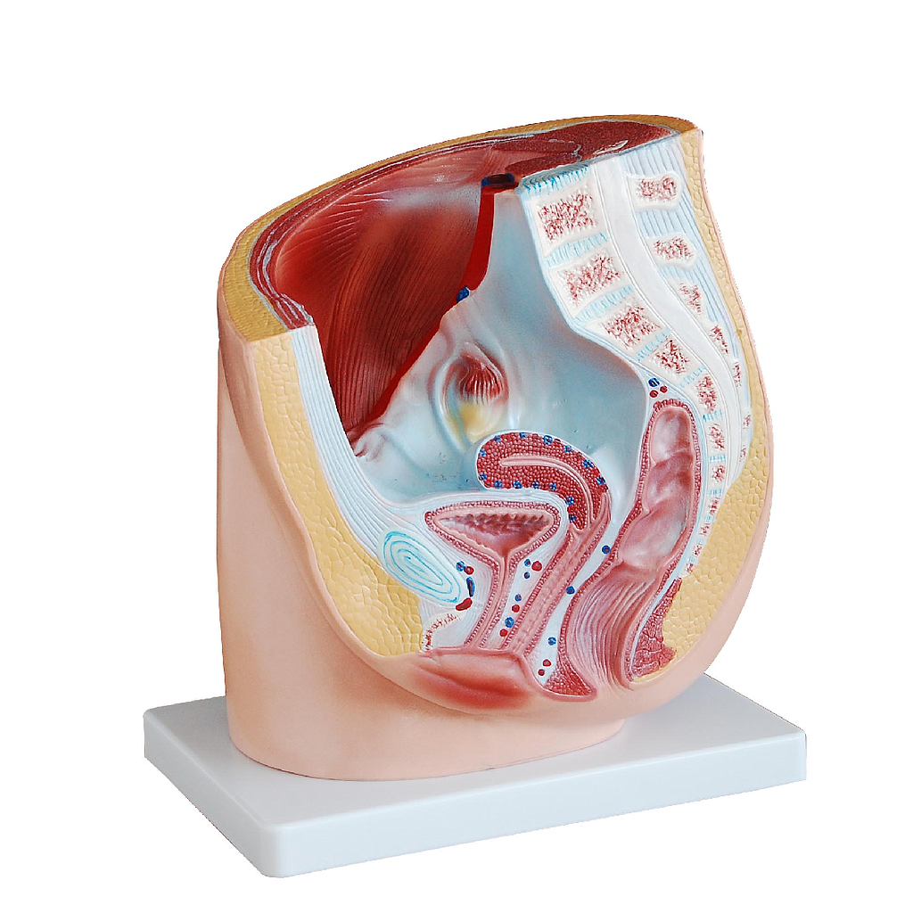 The median section model shows female genital organs with bladder and rectum. The abdominal and pelvis muscles are detailed shown.
