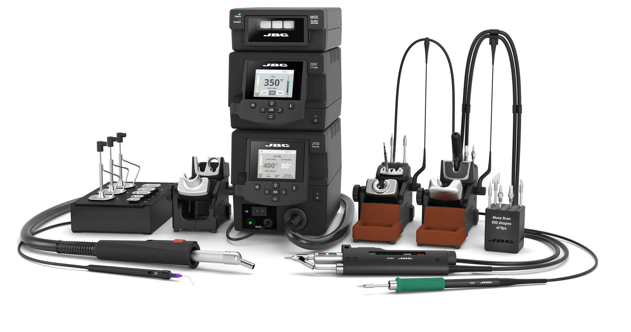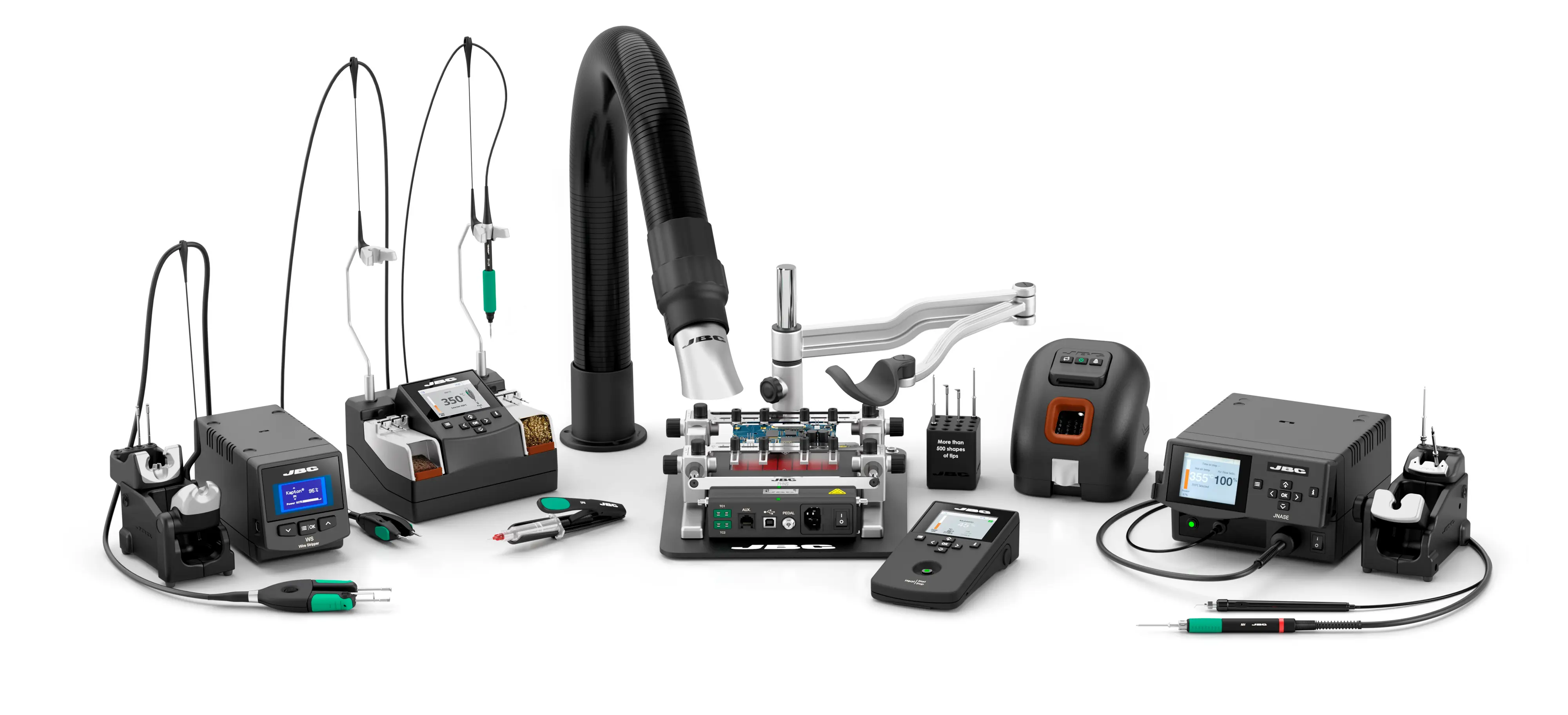Danh mục sản phẩm của JBC được hình thành xoay quanh quy trình hàn và làm lại mối hàn, tập trung vào tính chính xác và hiệu quả thao tác.