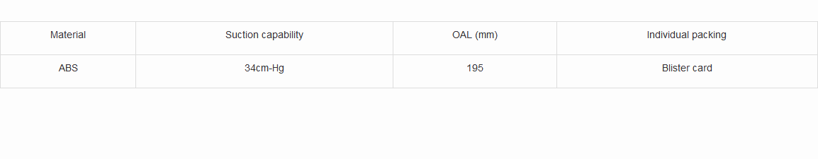- Material: ABS- Suction capability: 34cm-Hg- OAL (mm): 195