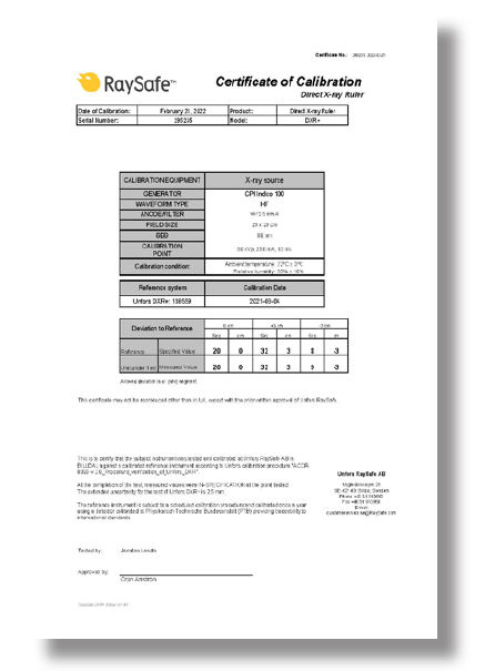 Certification that the specific DXR+ instrument was tested and calibrated at Unfors RaySafe AB against a calibrated reference instrument.