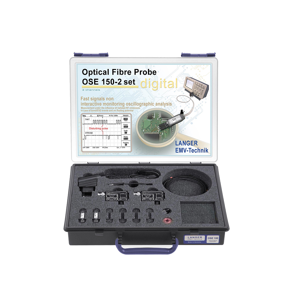 The set consists of two single sensors which are used to detect two digital signals within the device under test. It is connected via two fiber optical cables and two receivers to the oscilloscope. Inside the device under test a sensor transforms measured logical signals into light signals.