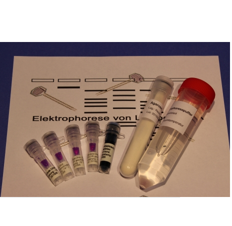 This set is needed for the preparation of lambda DNA in agarose gel electrophoresis and contains a double-stranded DNA genome of 48,502 base pairs of the bacteriophage lambda. In one experiment you can compare the uncut lambda DNA with an enzymatically cut lambda DNA.