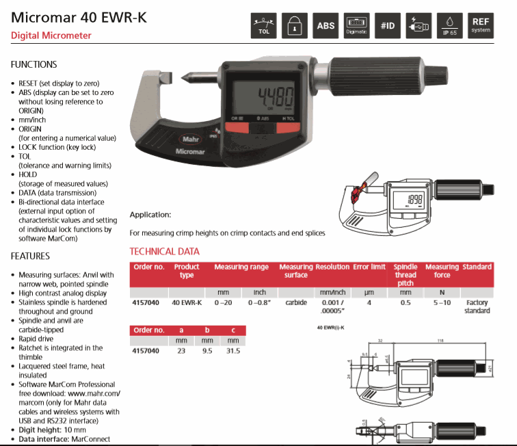 Panme đo ngoài điện tử Mahr 4157040 (40 EWR-K, 0-20mm/0-0.8") | EMIN.VN