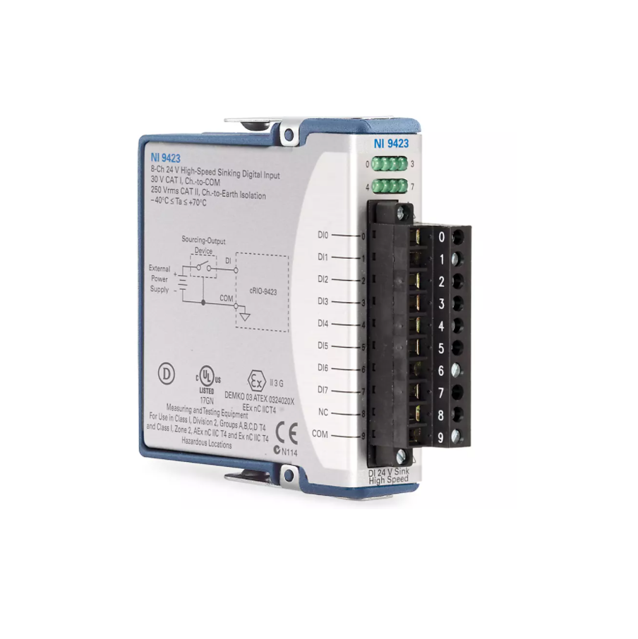 The C Series Digital Module interacts with a range of industrial switches, transducers, and devices. Some modules include an LED per channel that indicates the state of the channel. It supports input, output, or a combination of digital lines, and they can interact with a variety of voltages and logic levels, so they are well-suited for a variety of benchtop and industrial environments. Additionally, the C Series Digital Module also offers isolation options and sinking or sourcing capabilities to add further protection to your digital I/O application. When you use the C Series Digital Module with CompactRIO, you can use LabVIEW FPGA to create custom high-speed counter/timers, digital communication protocols, pulse generation, and more.The C Series Digital Module includes the NI-DAQmx driver and configuration utility that simplify configuration and measurements. NI-DAQmx supports NI programming environments as well as Python, ANSI C, C#.NET, and MathWorks MATLAB® software.