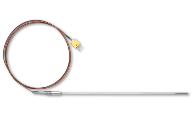 A Type K thermocouple probe that can measure up to 900°C (1650°F) when connect to the HOBO UX100 thermocouple logger. The stainless-steel probe is 30cm (12") in length and 0.5cm (3/16") in diameter, and is mounted on a 2.5cm (1") handle with spring-type strain relief. The 1.8m (6 foot) 19-AWG cable meets ANSI specifications, complete with isolated thermocouple color-coding for type K (yellow) thermocouples.