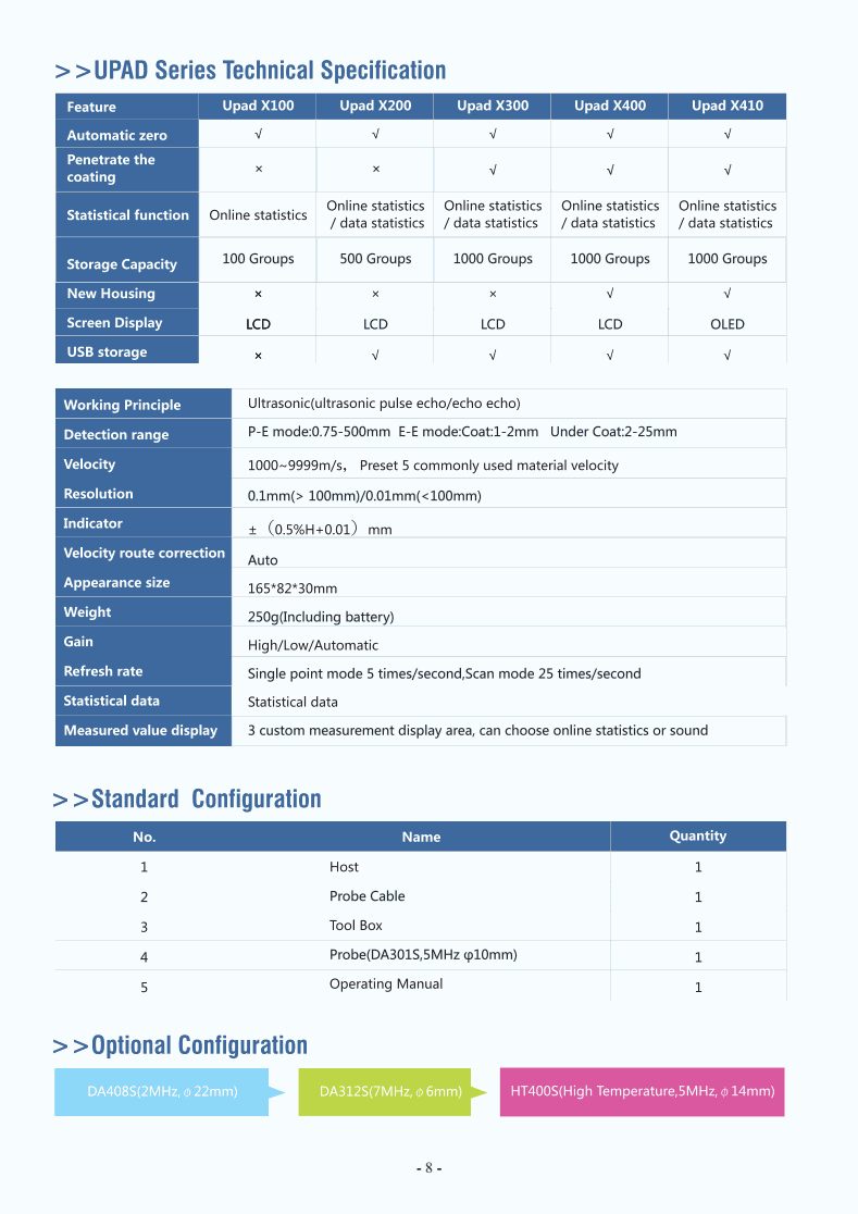 Chọn mua thêm: Đầu dò DA408S(2MHz, Ø22mm), DA312S(7MHz, Ø6mm), HT100S(Đầu dò nhiệt độ cao, 5MHz, Ø14mm)