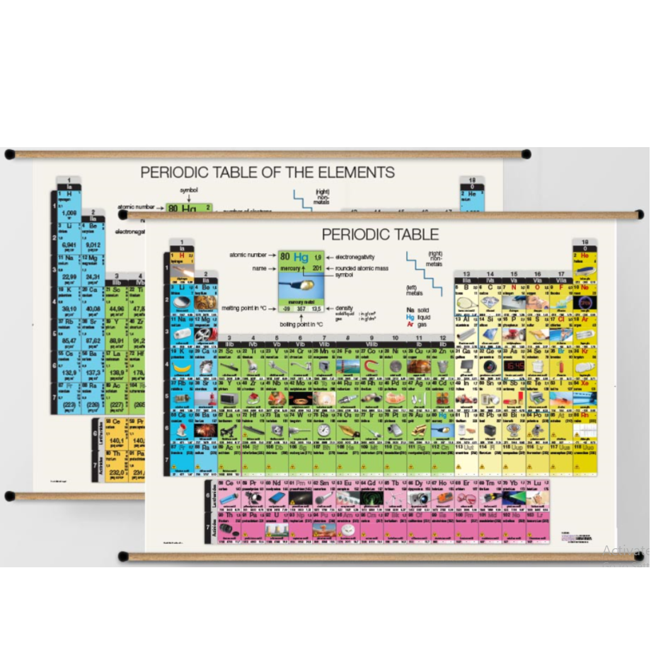 Periodic table of elements in giant poster size of 210 x 150 cm, with wooden rods. Double-sided, with one side showing a version with images illustrating the use of each element and on the other side a very detailed scientific version.